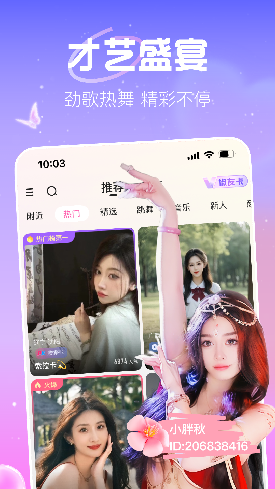 应用详情:花椒,Hay一款3亿用户都在玩的全球直播交友平台,24小时直播不断,动感音乐、清新卖萌、神模仿,有料有颜还会玩转热点,百般花样的潮流直播带给你砰砰心跳,是的, 高颜值又时尚的小哥哥小姐姐都在花椒,就等你来pick!